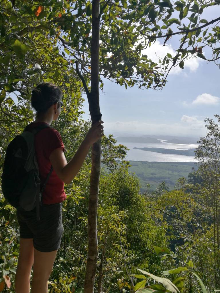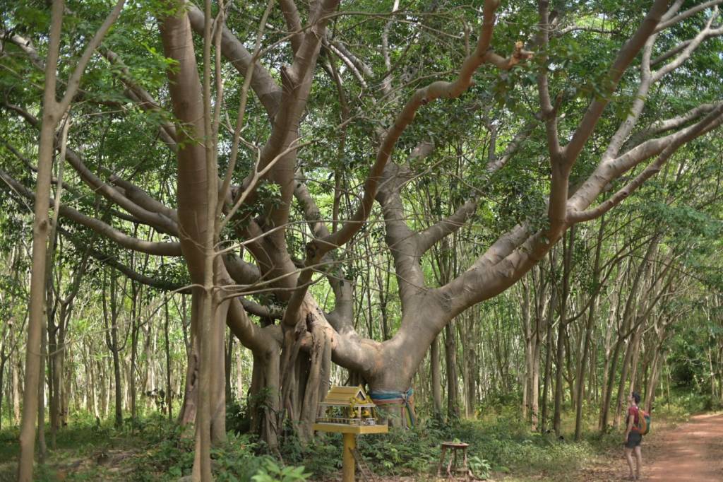 The next morning we summit the mountain, against the guest house owner’s recommendations – he insists we need a local guide to access the trial, find the way and dodge the resident King Cobras. We read fellow travellers’ descriptions online, rent a scooter and find the trailhead easily. It turns out that the trail is clearly defined and not particularly challenging the except for one steep part where the extremely dry leaves and soil underfoot are slippery. We work up a sweat climbing the steep trail through the jungle and are rewarded with views across the ocean to a number of other islands. On the way down Jonathan spots a familiar plant: the superfood moringa. We chew on a few leaves,i figuring we need all the immune boosts we can find.