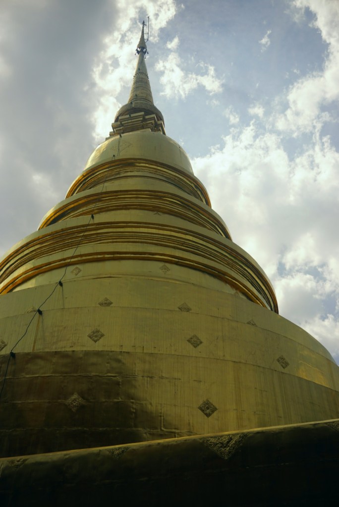 The view of the city below is wonderful and we’ve intentionally arrived just before sunset to catch the best light. After circling the outer courtyard we venture into the inner sanctum, a square courtyard ringed in Buddha statues, murals, and nooks that hold devotional offerings of candles and flowers. In the center rises a spectacular gold-plated spire in the typical Thai style, whose facade is set ablaze by the last rays of the setting sun. Worshipers and tourists circle the spire. Which is which or whether that distinction even makes sense I can’t say as I observe foreigners and Thai-looking visitors alike pose for one portrait shot after another, hands demonstratively joined as if in prayer just for the photo. Ah, what irony: capturing a selfie – the ultimate expression of 21st century vanity – seems to be most visitors’ main objective as they stand in the heart of a place founded on the very premise of the ego being an illusion.